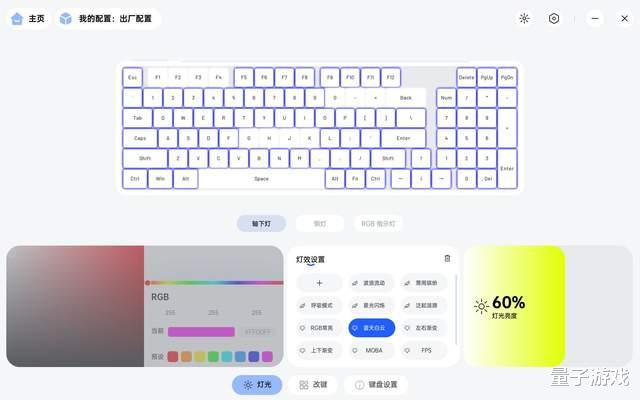 键盘顶上那排功能键预设了灯光和连接的快捷操作。雷柏的A Hub驱动界面异常简洁,按键功能可以自由定义,宏操作或者复杂的组合键都能设。最满意的是灯效调整能精细到1%的亮度变化,满足我们在游戏时的个性化RGB需求,办公等场合也可以关闭灯效,或者是只留极低亮度照明键位,眼睛不会感到刺眼。我们可以预先准备八个配置文件在键盘上,根据不同的使用需求进行切换,足够满足不同场景切换使用。